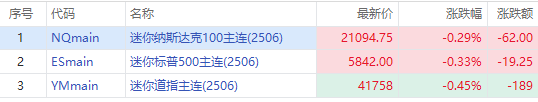 三大指数期货小幅下挫,纳指期货 $NQmain 跌0.29%,标普期货 $ESmain 跌0.33%,谈指期货 $YMmain 跌0.45%