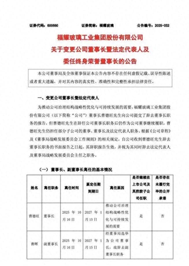 10月16日,福耀玻璃发布公告称,董事长曹德旺因推动公司治理结构战术性优化与可不竭发展的需要,辞去董事长职务。公司选举曹晖为新任董事长,并任命其为法定代表东说念主及董事局战术发展委员会主任。