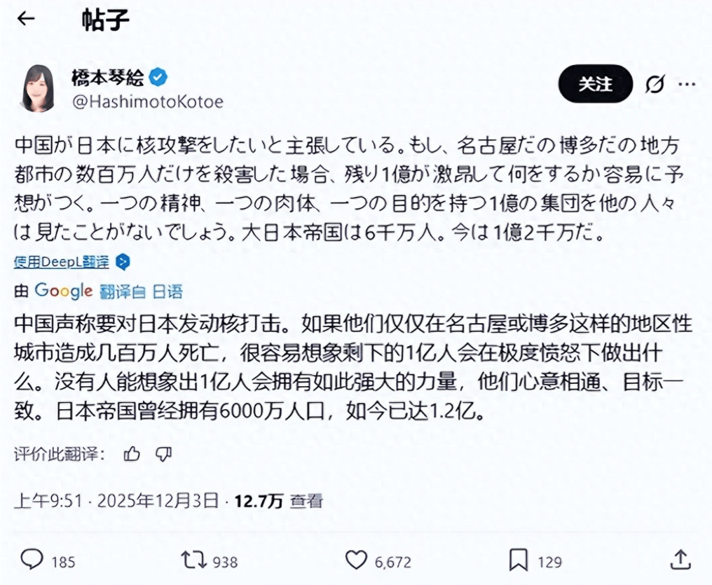 东亚地缘安全步地再添噪音,日本右翼顶点东说念主物桥本琴绘近期抛出的核冲突言论激发平凡回荡。其声称 “中国若对日本推行核打击,幸存者将发起报复”的荒唐表述,不仅深刻了对海外核递次与中国核政策的深层诬陷,更折射出日本右翼借顶点言论操弄政事、鼓舞军事膨胀简直凿图谋,给本就复杂的地区安全局势蒙上暗影。