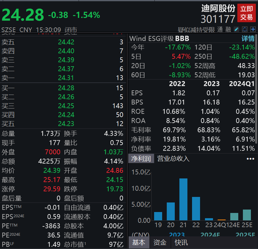 二级市场上,铁心4月30日收盘,迪阿股份跌1.54%,报24.28元/股,股价较旧年1月时相对高点已跌去65.77%。