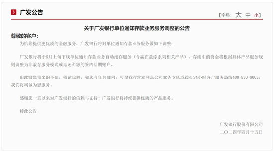 广发银行日前发布公告暗示,将于5月上旬下线单元示知入款业务自动滚存工作(含赢在益添系列干系产物),存续中的资金将凭据具体产物工作递次诊治为非滚存工作方式或返还至客户的签约活期账户。