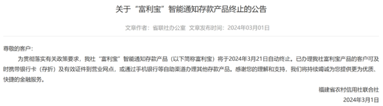 本年3月1日,福建省农村信用社纠合社发布《对于“富利宝”智能示知入款产物拆开的公告》称,“富利宝”智能示知入款产物于2024年3月21日自动拆开。随后,福州农商行、连江农商行、三明农商行等多家农商行、村镇银行接踵跟进,于3月21日自动拆开“富利宝”智能示知入款产物。