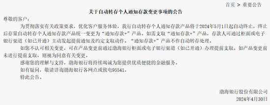近日,渤海银行发布公告称,渤海银行自动转存个东谈主示知入款产物于2024年5月1日起自动拆开,拆开后存量自动转存个东谈主示知入款产物协调变更为“示知入款+”产物。