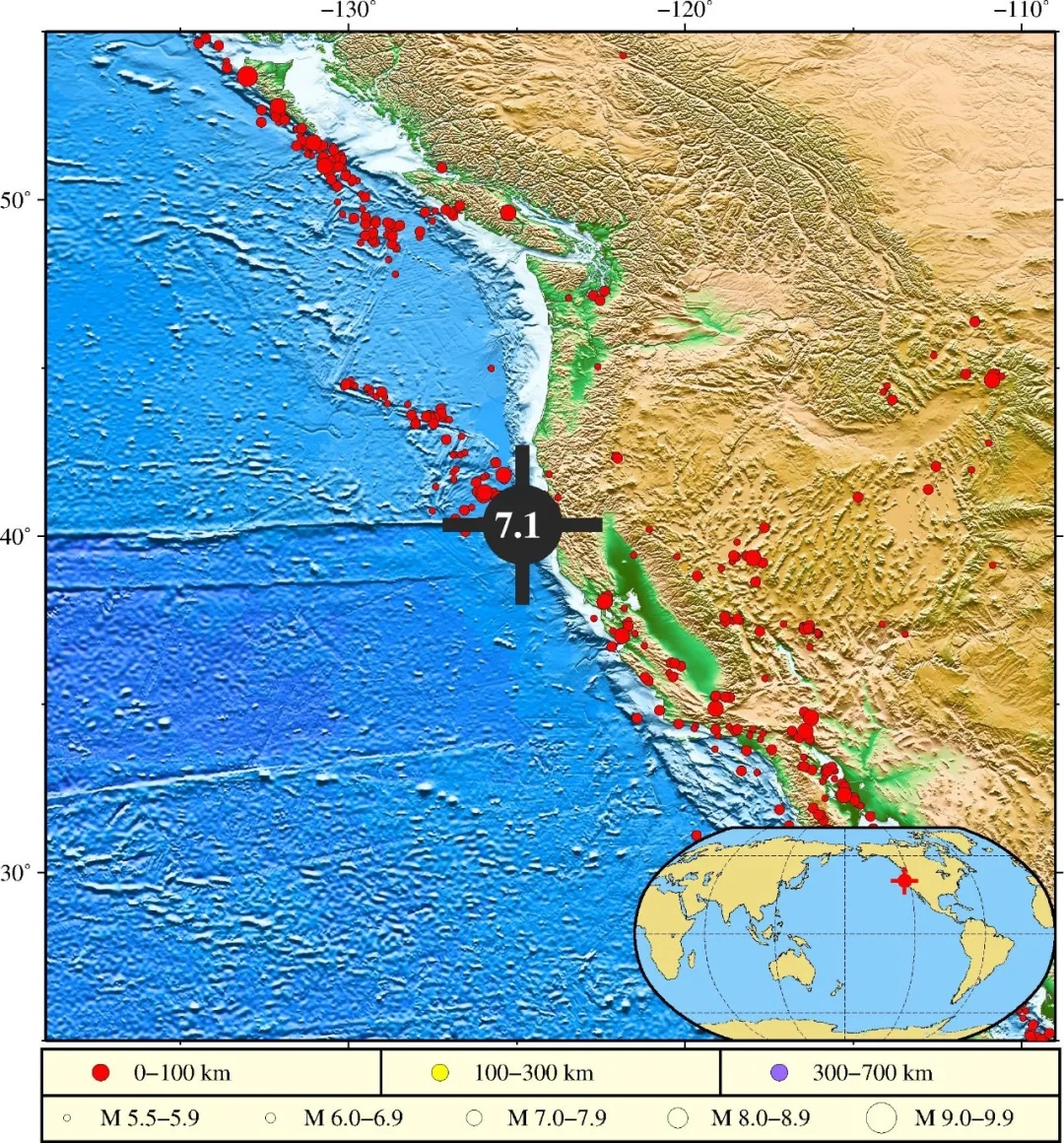 中国地震台网进展测定,北京本事12月6日2时44分(当地本事12月5日10时44分)在好意思国加利福尼亚州北部沿岸近海发生7.0级地震,震源深度10公里,震中位于北纬40.40度,西经125.00度。