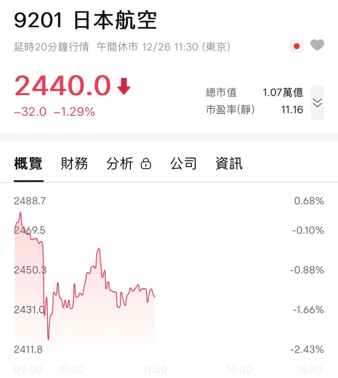 今日,日本航空股价盘中跳水,一度跌超2%,午间收跌1.29%。与此同期,日本股市总体弘扬强势,日经225指数午间收涨0.53%。